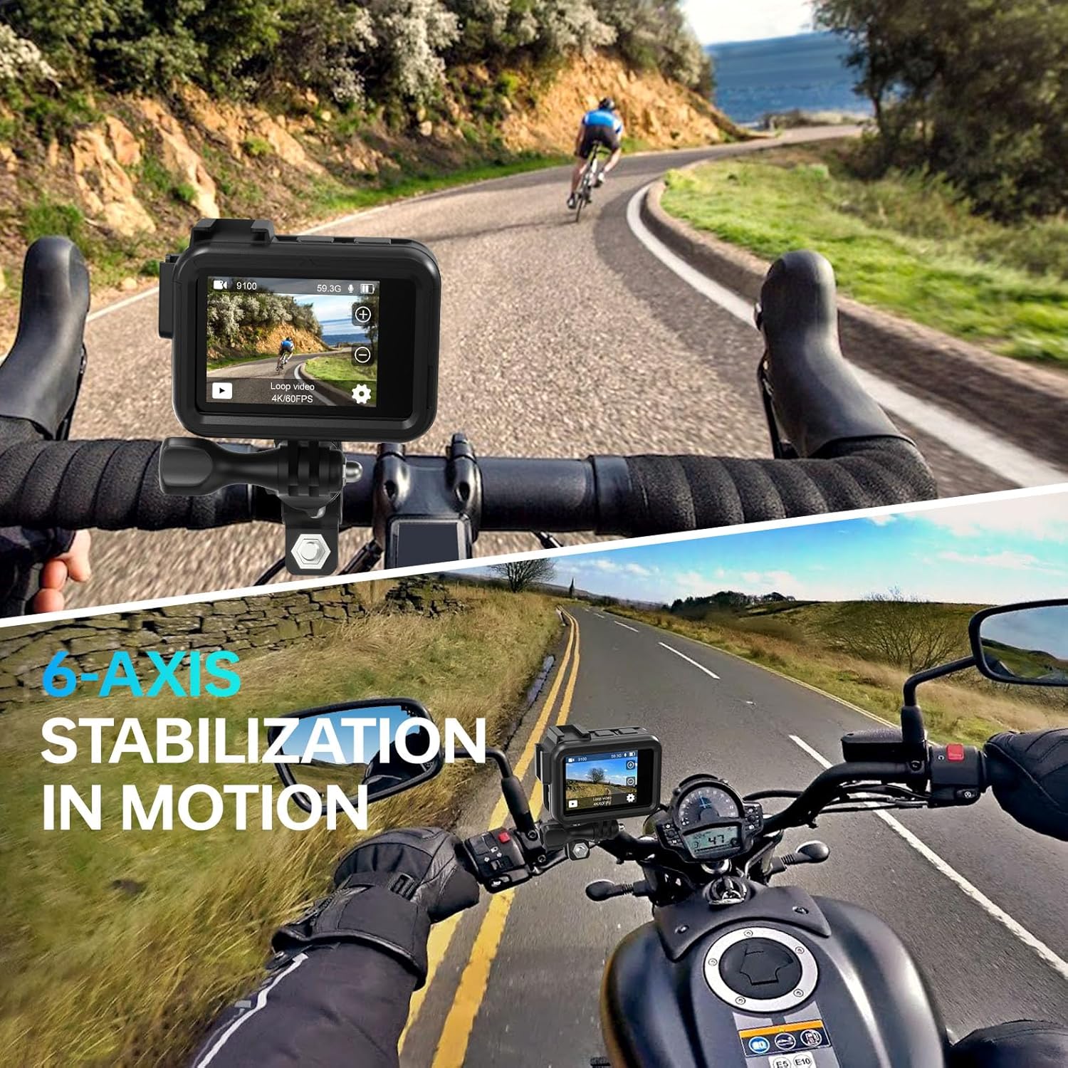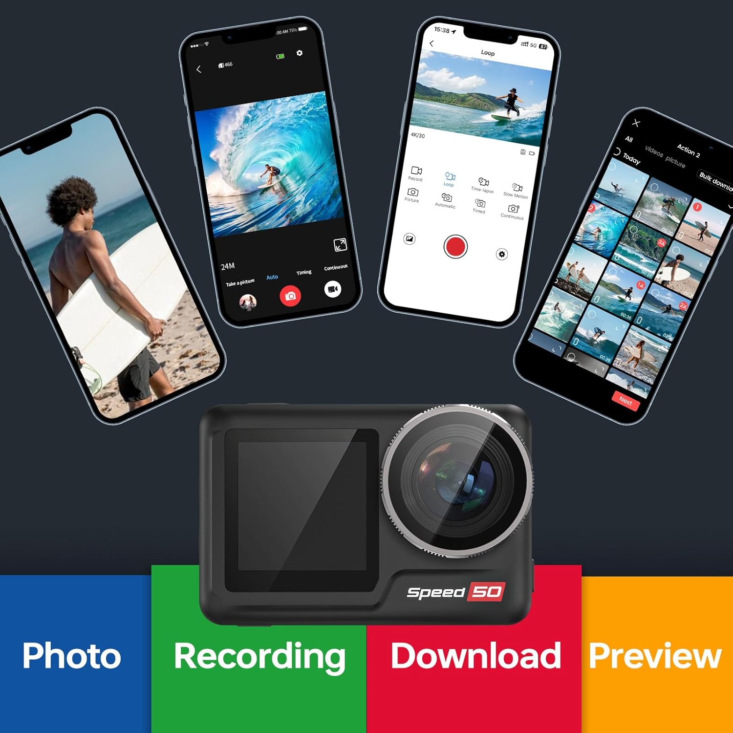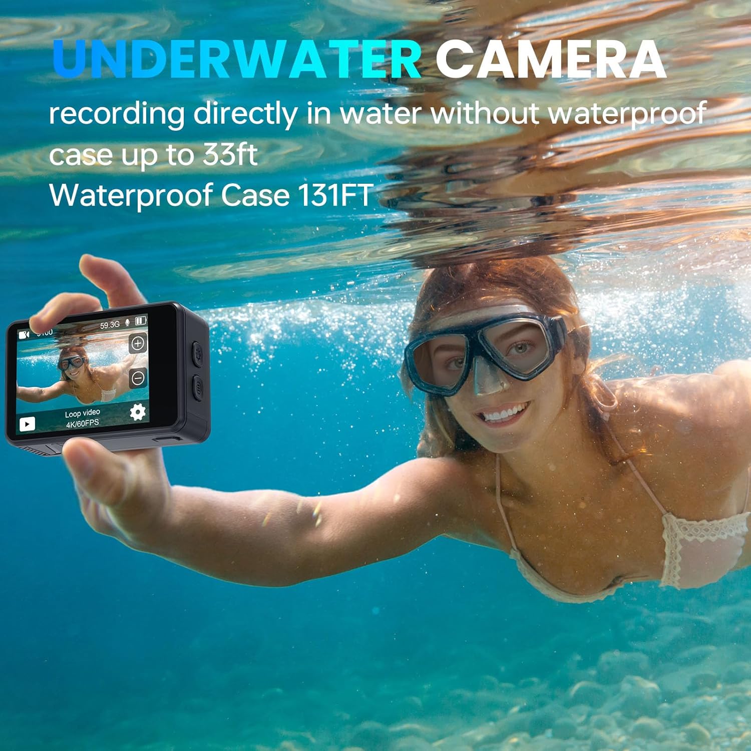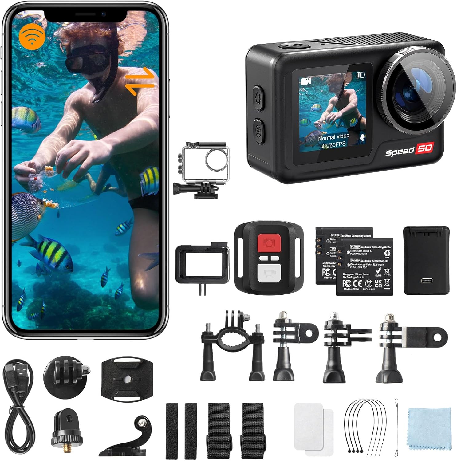 Action Camera Speed 50 4K60FPS 30MP WiFi with 2″ Touch Screen EIS 5X Zoom Remote Control,Bare Machine Waterproof 33FT with Waterproof Case 131FT, 2x1550mAh Battery, Vlog Camera