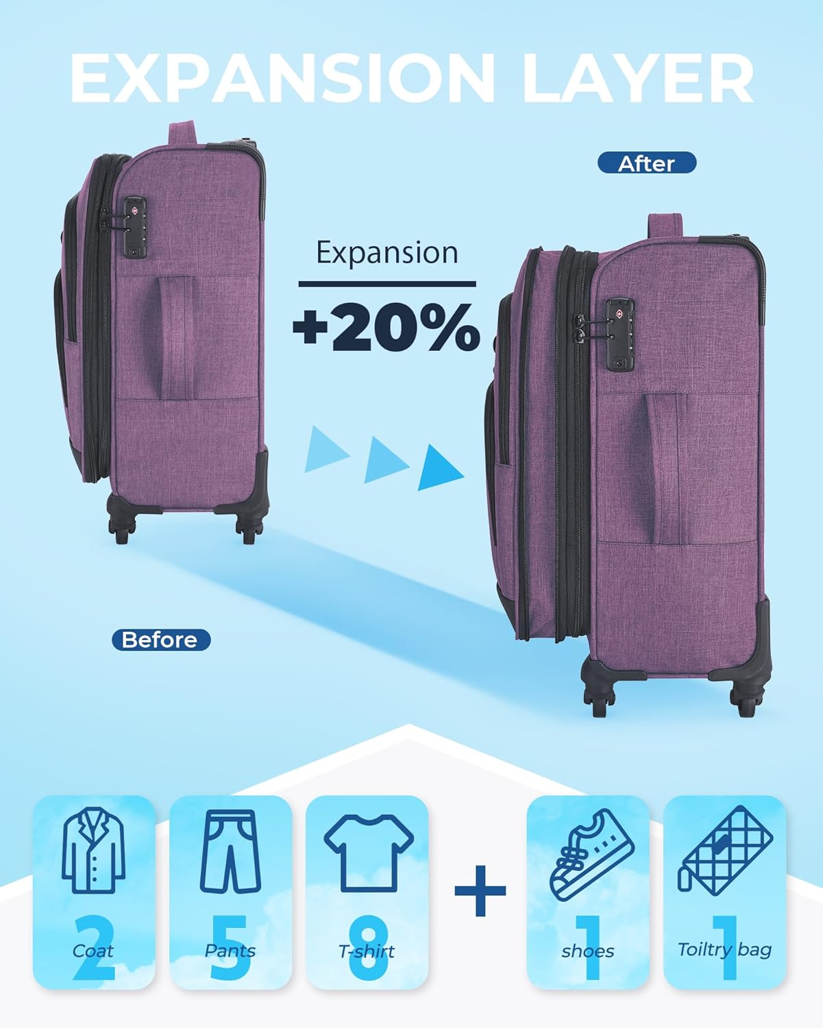 Introducing the BAGSMART Expandable 20-inch Carry-On Luggage Set in a chic and stylish purple color! This sleek and functional suitcase is perfect for all your travel adventures, whether you’re jet-setting across the globe or heading on a weekend getaway.